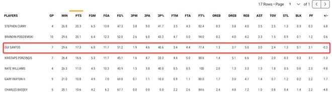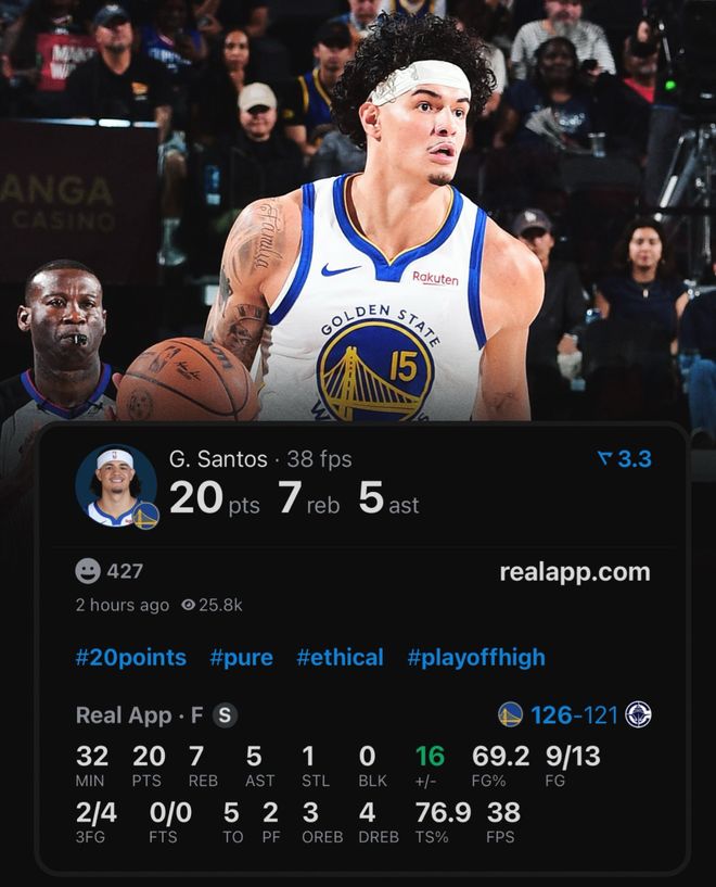 桑托斯全場(chǎng)比賽32分鐘,13中9,三分4中2,拿到20分7籃板5助攻1搶斷,命中率69.2%,三分命中率50%,真實(shí)命中率76.9%,正負(fù)值+16勇士全隊(duì)第一。