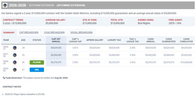 早些時(shí)候勇士與桑托斯提前續(xù)約三年1500萬(wàn),下賽季桑托斯的薪水上浮到462萬(wàn),28-29賽季是桑托斯的球員選項(xiàng),桑托斯才23歲勇士這份續(xù)約合同贏麻了。