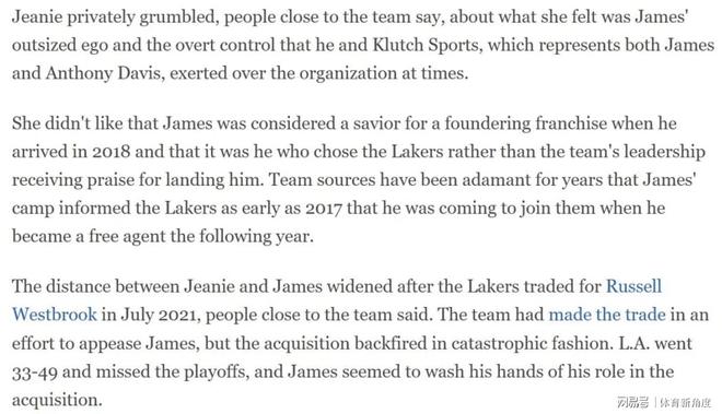 其四,2021年7月那筆拉塞爾·威斯布魯克的交易,成為了珍妮·巴斯與詹姆斯關系惡化的重要轉折點。當時,球隊為了迎合詹姆斯的意愿推動了這筆交易,然而結果卻是一場災難。湖人在該賽季僅取得33勝49負的戰(zhàn)績,無緣季后賽。更讓珍妮·巴斯不滿的是,詹姆斯似乎試圖撇清自己在推動這筆交易中的角色,缺乏應有的擔當。據(jù)知情人士透露,珍妮·巴斯私下對詹姆斯這種“缺乏擔當”以及在威少交易后“將責任推給他人”的做法極為不滿。