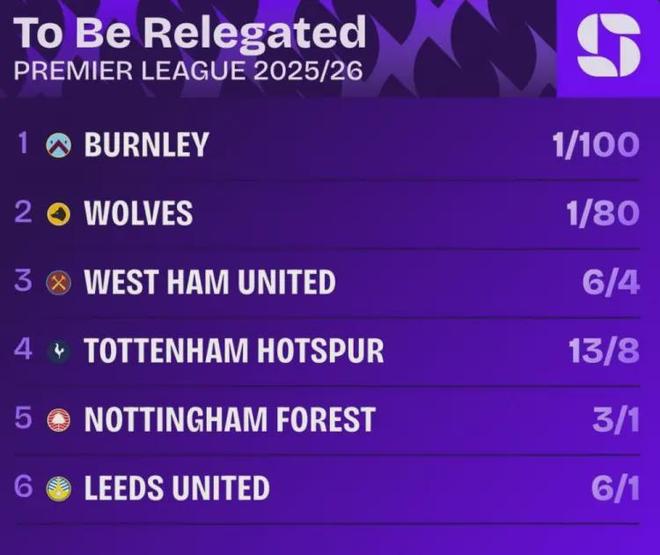 雪上加霜的是,熱刺的保級處境已然岌岌可危。目前,他們的降級賠率排名英超第四,僅低于伯恩利、狼隊和西漢姆,身后的諾丁漢森林、利茲聯(lián)士氣正盛,隨時可能完成反超。更致命的是,后續(xù)賽程堪稱“地獄模式”:下周要迎來歐冠16強(qiáng)對陣馬競的生死戰(zhàn),隨后做客安菲爾德挑戰(zhàn)利物浦,剩余聯(lián)賽中,既有阿森納、切爾西等爭冠強(qiáng)隊,也有森林、利茲聯(lián)等保級直接對手,雙線作戰(zhàn)的壓力之下,熱刺的保級之路難如登天。