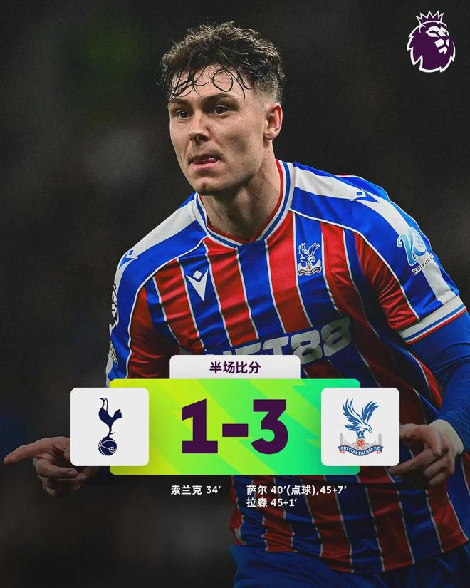 這場潰敗,是熱刺近期頹勢的集中爆發(fā),更是球隊混亂的真實寫照。比賽的轉(zhuǎn)折點出現(xiàn)在第38分鐘,主力中衛(wèi)范德芬作為最后一人拉倒單刀的薩爾,吃到紅點套餐,薩爾親自主罰命中扳平比分。在此之前,索蘭克的進(jìn)球曾讓熱刺短暫看到希望,但紅牌之后,球隊徹底崩盤:上半場補(bǔ)時階段,拉爾森穿襠破門反超,薩爾再下一城完成雙響,短短13分鐘,熱刺從1-0領(lǐng)先淪為1-3落后,主場球迷紛紛提前退場,用沉默控訴著球隊的狼狽。