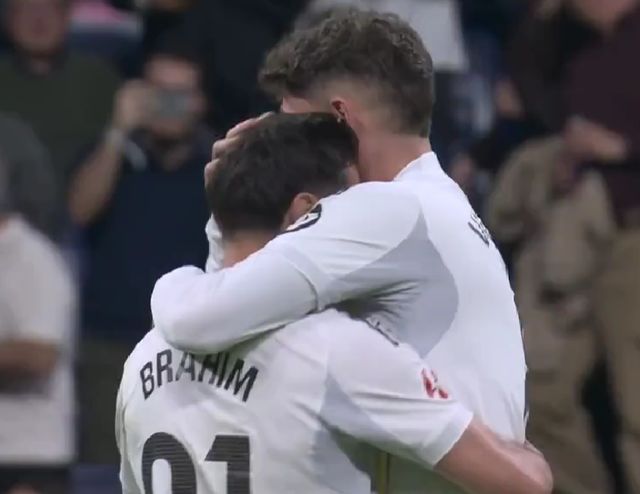 比賽開始后,皇馬就如猛虎下山一般沖擊客隊禁區(qū),企圖一口氣吃掉對手。遺憾的是,皇馬卻遲遲沒能打破場上僵局。直到下半場第51分鐘,依靠巴爾韋德在禁區(qū)外一腳神來之筆的遠(yuǎn)射,才敲開了對手大門。