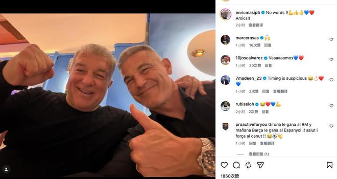 拉波爾塔身邊顧問(wèn)、也是其助手之一的恩里克-馬西普曬出了一張與拉波爾塔的合影。照片中,兩人都顯得十分高興,一邊豎起大拇指,一邊握拳舉起手臂,擺出慶祝勝利的姿勢(shì)。