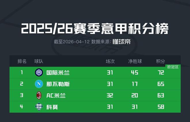 今晚的意甲比賽里,米蘭0-3不敵烏迪內(nèi)斯,遭遇聯(lián)賽兩連敗,多賽一場(chǎng)的情況下繼續(xù)落后同城對(duì)手國米9分。本輪國米和那不勒斯都尚未出戰(zhàn),目前相差7分的這兩隊(duì),大概率將成為本賽季意甲冠軍的主要競(jìng)爭(zhēng)者了。
