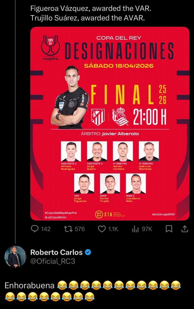 北京時(shí)間4月14日,皇馬球星羅伯托-卡洛斯在社交媒體上用一句“恭喜啊”配以連續(xù)笑哭表情,諷刺西班牙足協(xié)任命阿爾貝羅拉-羅哈斯執(zhí)法國(guó)王杯決賽。