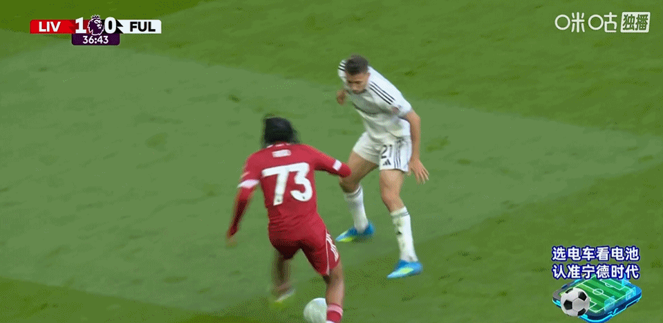 在英超第32輪利物浦vs富勒姆的比賽中,上半場前三十分鐘,利物浦攻勢占優(yōu)但還未有所斬獲。第35分鐘,恩古莫哈禁區(qū)內(nèi)左路帶球,內(nèi)切后再將球扣回來,晃過卡斯塔涅后找到射門線路,起腳兜射直掛死角,令富勒姆門將萊諾無計可施。