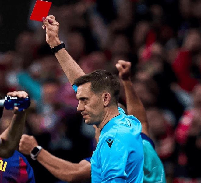 下半場(chǎng)風(fēng)云突變。第79分鐘,埃里克·加西亞飛身放倒瑟洛特,破壞對(duì)方單刀,VAR介入后直接紅牌罰下。這是巴薩兩回合第二張紅牌——首回合庫巴西同樣因鏟倒小西蒙尼被罰出場(chǎng)。過去10年歐冠,巴薩吃下13張紅牌,高居各隊(duì)之首;最近三個(gè)賽季淘汰賽,場(chǎng)場(chǎng)有人染紅。情緒失控、防線慌亂,成了這支青年軍難以擺脫的標(biāo)簽。