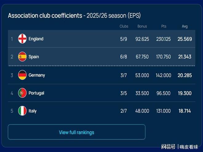 根據(jù)歐足聯(lián)最新公布的積分榜來看,英超遙遙領先,西甲和德甲分別排在二三名,兩個聯(lián)賽還有不到1.1分的差距。緊隨其后的葡超和意甲,基本上沒有擠進前兩名的希望了。
