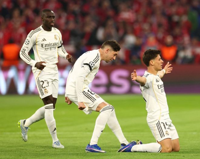 這一個(gè)比賽日,皇馬迎來(lái)了歐冠1/4決賽次回合生死戰(zhàn)的考驗(yàn),奔赴安聯(lián)球場(chǎng)挑戰(zhàn)拜仁慕尼黑,本場(chǎng)比賽皇馬靠著居萊爾的雙響和姆巴佩的進(jìn)球,三度在客場(chǎng)取得了比分上的領(lǐng)先,但是卡馬文加最后時(shí)刻被罰下成為了轉(zhuǎn)折點(diǎn),拜仁最終靠著帕夫洛維奇、凱恩、迪亞斯和奧利塞的進(jìn)球,4-3逆轉(zhuǎn)獲勝,兩回合總比分6-4晉級(jí)。