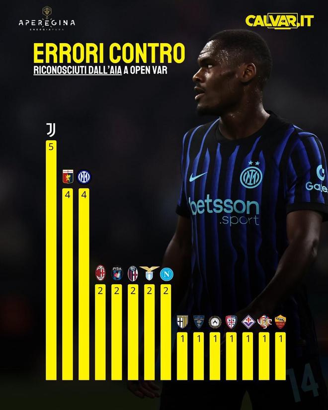 本賽季意甲球隊(duì)遭遇VAR誤判次數(shù):