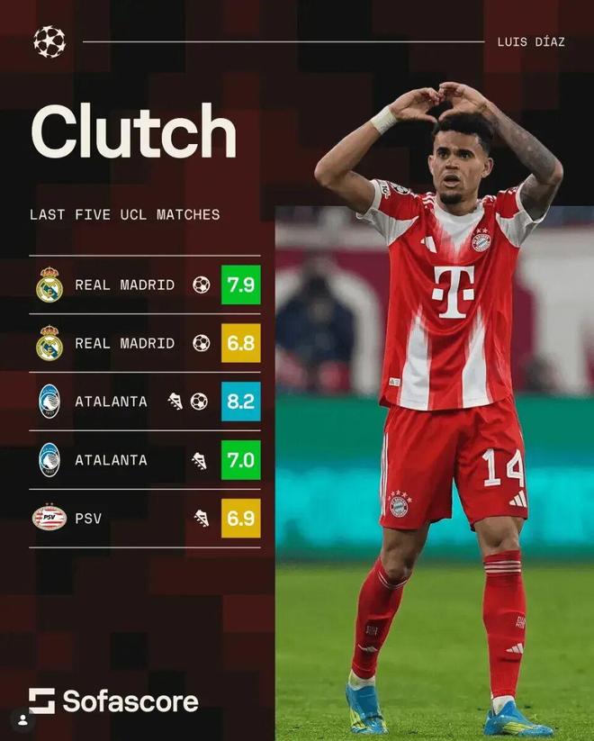 凌晨歐冠1/4決賽,拜仁主場4-3皇馬,兩回合總比分6-4淘汰對手晉級半決賽。去年夏天加盟球隊的迪亞斯在兩回合比賽中都貢獻(xiàn)了進(jìn)球。此外,三輪淘汰賽他也是主導(dǎo)者。