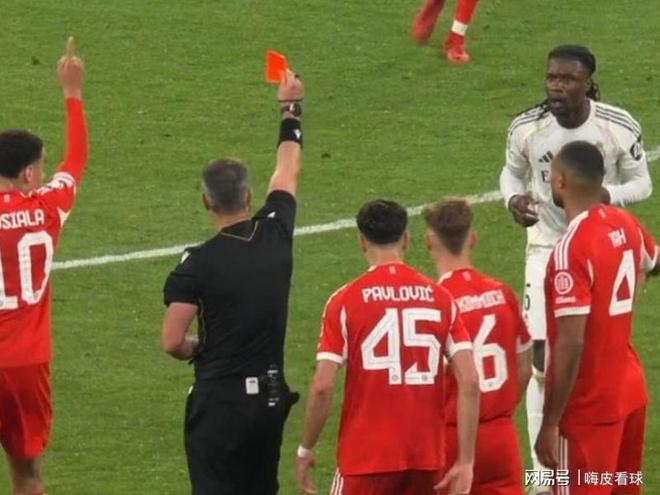 隨后,兩隊各進兩球,拜仁上半場一球落后,總比分為4-4,皇馬看到了晉級的希望??上У氖?,卡馬文加毫無必要的拖延時間動作,領到黃牌,裁判第一時間沒有意識到,這是皇馬中場本場比賽的第二張,似乎在拜仁球員的提醒下,才出示了紅牌。