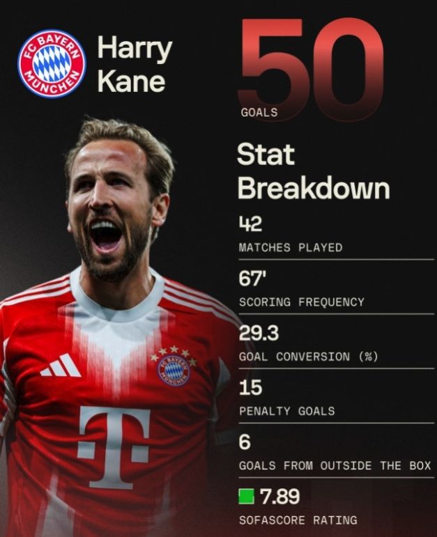 這其中,凱恩的出色發(fā)揮功不可沒,此役他打入1粒進(jìn)球,這不僅是他個人本賽季歐冠打入的第12粒進(jìn)球,更是他本賽季打入的第50粒進(jìn)球!據(jù)統(tǒng)計,凱恩42場比賽打入50球,平均每67分鐘一球,射門轉(zhuǎn)化率高達(dá)29.3%!在本賽季歐冠打入15球的姆巴佩被淘汰之后,他將成為金靴的有力爭奪者!