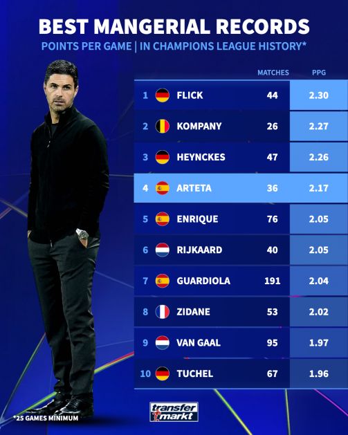 阿爾特塔以場均2.17分排在歷史第四,他一共執(zhí)教了36場歐冠,戰(zhàn)績?yōu)?4勝6平6負(fù)。他執(zhí)教的第一場歐冠是2023年對陣?yán)仕埂?/p>