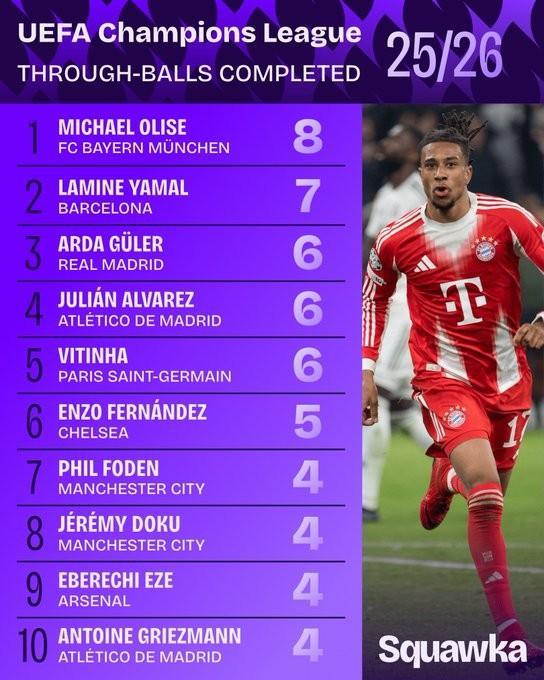 根據(jù)統(tǒng)計,本賽季到目前為止,奧利塞在歐冠當中成功送出了8記直塞球,位列該賽事第一,亞馬爾位列第二。